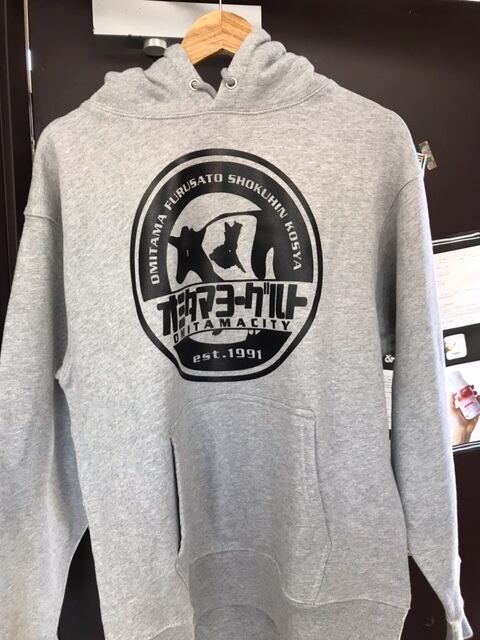 フードの形状が綺麗で立体的な大きめサイズとざっくりとしたサイジングが特長のヘヴィーパイルのプルオーバーパーカにオミタマヨーグルトのロゴを印刷しました(前面のみ)