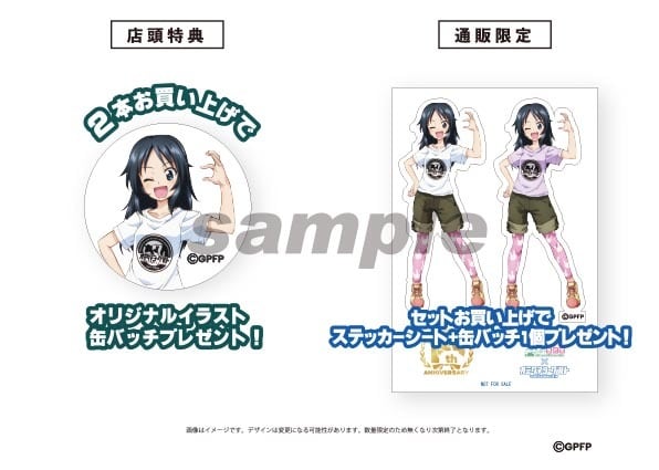 今年は「通販限定」のおまけとして「Tシャツ色違いのあゆみちゃんステッカーシート1枚」+「缶バッチ1個」が同梱されます。ステッカーは防水仕様でドラムやベース、パソコンやスマホに貼るのにも最適なサイズです。